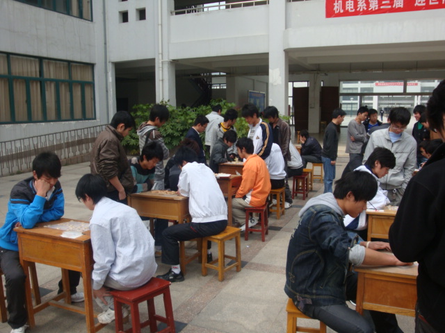 第三届机电系“迎世博”象棋比赛于4月25日在东教学楼天井广场举行。此次活动由机电系团总支、学生会体育部承办。