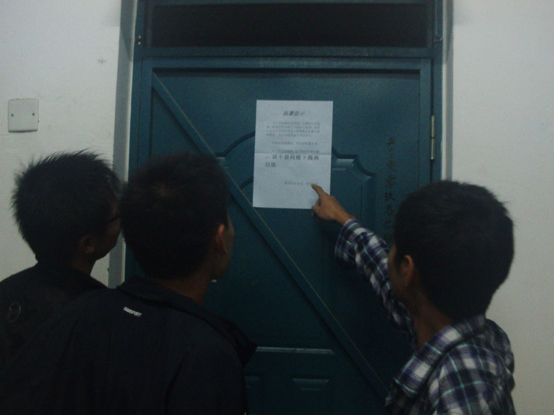10月12日晚自习,团总支学生会还组织系干们还将印发好的带有“温馨提示”字样的传单发送到各个班级以及发送到各个宿舍,并要求贴到寝室门后。并且我系还以横幅做宣传,以此提醒同学要提高自觉意识,保护我们的校园。