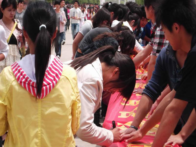 正直放学时刻,签名活动现场人流攒动,里里外外围满了前来签名的同学,为了使大家更加的了解五四运动,机电系学生会还组织系干向大家介绍有关五四运动的知识,大家纷纷在横幅上签下青春的理想与希望,那一行行优美的字迹流露激昂的青春气息。整个活动历时一个半小时,最后圆满结束。