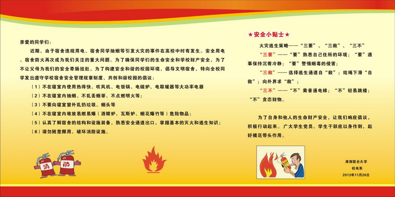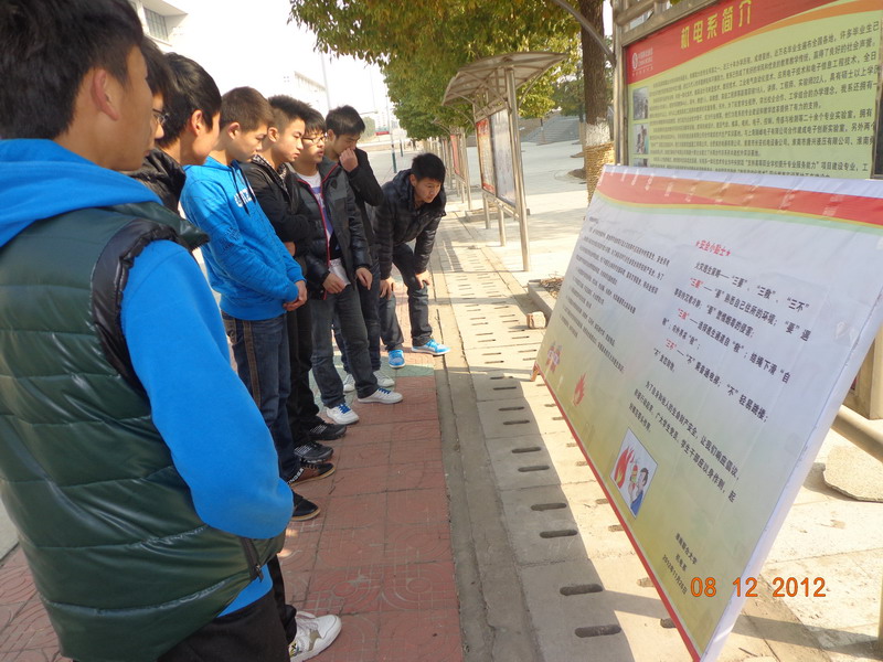 为了深入贯彻党的十八大精神,提高同学们的安全意识,增强自我保护能力,构建平安和谐校园。机电系团总支学生会近期组织开展了以“安全意识”为主题的校园安全倡议活动。我们制作了安全知识展板放置在校园中进行宣传,还成立宣传小组深入教室与寝室进行安全宣讲。