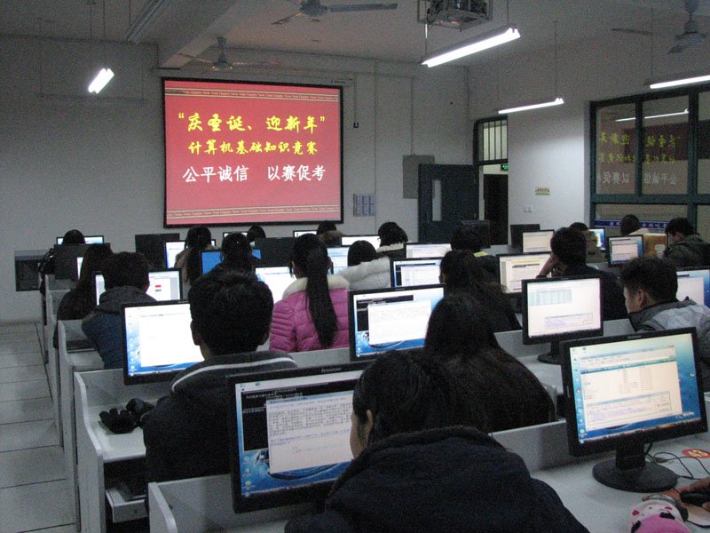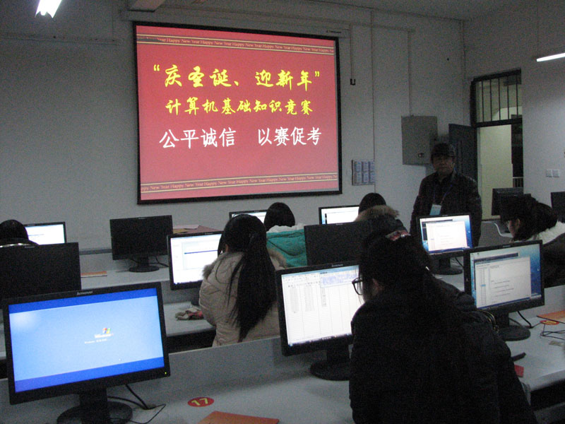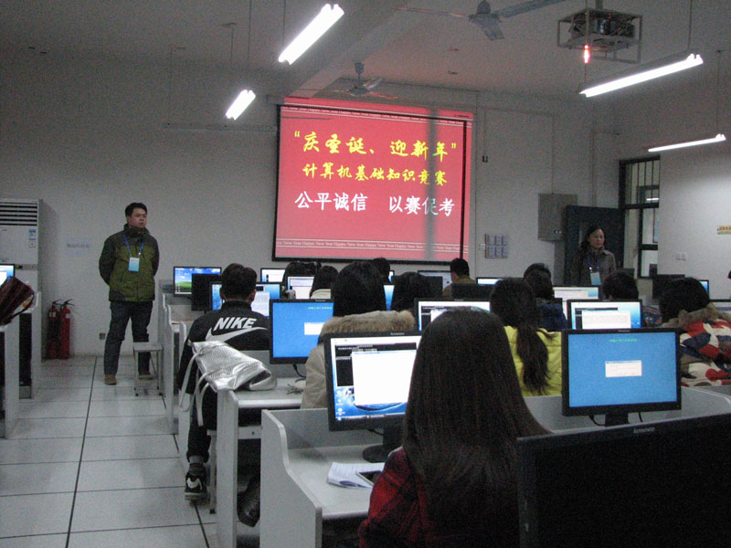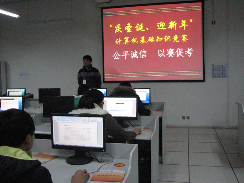 为丰富同学们的节日生活,2014年12月25日圣诞之夜,机电系在实训楼机房举行举办了以“公平诚信,以赛促考”为宗旨的“庆圣诞、迎新年” 计算机基础知识竞赛活动。此次竞赛共有来自机电系和政文系近200名同学报名参加,在整个竞赛过程中,同学们能够自觉自律,秩序井然。