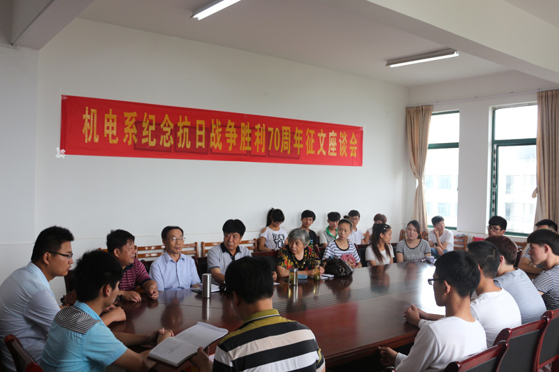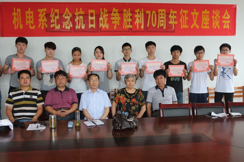 此次征文活动,以中国人民抗日战争为主要内容,以“铭记历史、缅怀先烈、珍爱和平、开创未来”为主题,讴歌中国人民不屈不挠、英勇抗争的爱国主义精神,先后共收到近百余篇文章。为了更进一步激发广大同学的爱国之情,凝聚起同心共筑中国梦的强大力量,机电系于2015年6月25下午在系会议室举行纪念抗日战争70周年座谈会暨征文颁奖活动。