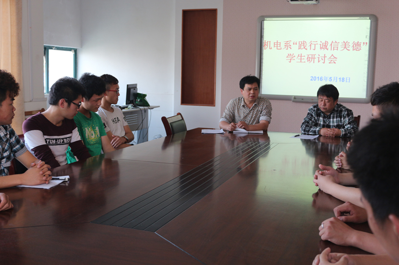 5月18日下午,机电系在系会议室召开“践行诚信美德”学生研讨会暨机电系学生资助诚信教育主题月活动启动仪式,14级和15级获得国家奖助学金学生代表以及办理国家助学贷款的学生参加研讨。会议由系总支书记主持。