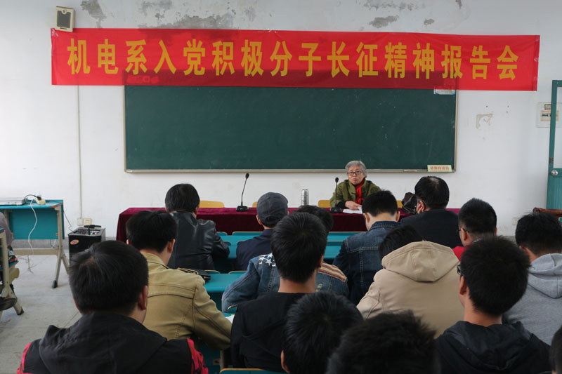 11月1日下午,为纪念红军长征胜利80周年,学习和弘扬长征精神,机电系特邀校关工委李老师为全系学生入党积极分子做了一场专题报告会。报告会由系党总支书记主持。