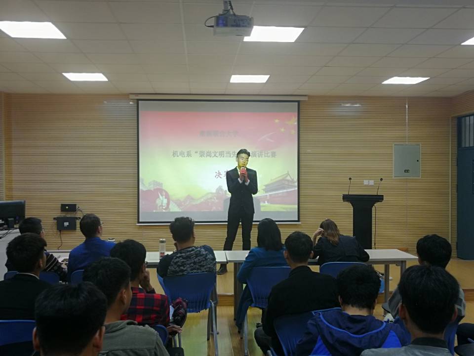 丰富校园文化生活,强化意识形态教育,5月25日下午,机电系在校实训楼情景教室举行了“崇尚文明当先锋”主题演讲比赛决赛,教师代表、班主任辅导员及各班级学生代表参加了此次活动。